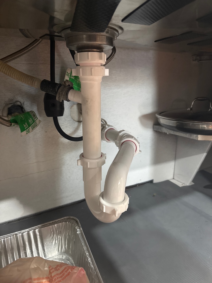 Completed replacement of the kitchen sink P-trap and drainage assembly due to leaks and worn components. Removed the old trap and drain piping and installed a new P-trap, extension tube, and slip-joint fittings to ensure proper drainage and prevent sewer gases from entering the home. All connections were tightened and the system was tested under running water to confirm proper flow and no leaks.